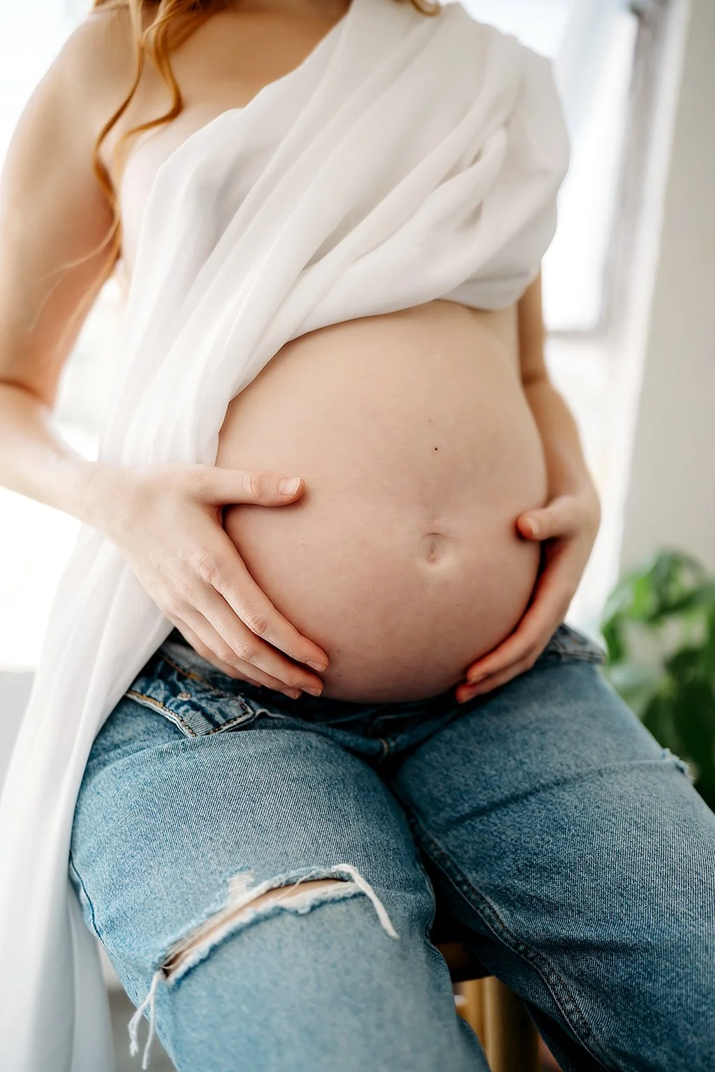 One of the things I love about studio maternity sessions is the ability to control every aspect of the shoot, from the lighting and composition to the styling and props. And for this session, I wanted to incorporate a bold and eye-catching element that would truly set the images apart. The blue foil provided a striking contrast to the soft and gentle curves of the baby bump, while also adding an element of creativity and playfulness to the images.
